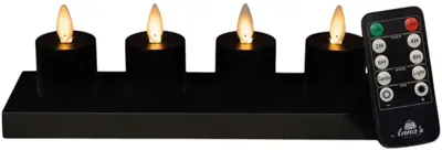 Set van vier Anna's Collection LED theelichten flame effect zwart en een oplaadstation.Met vlam effect: flikkerende en bewegende vlamMet multifunctionele afstandsbediening (timer, mode, dim, aan/uit)Met oplaadstation