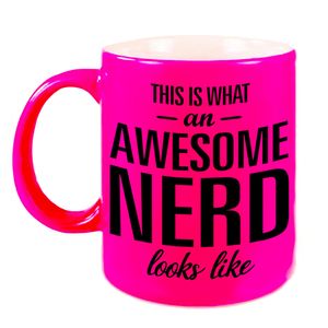 Meer over Awesome nerd / slimmerik cadeau mok / beker neon roze 330 ml