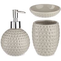 Badkamer accessoires set 3-delig kiezelgrijs van keramiek. Deze set bestaat uit een zeepblokhouder/schaaltje, een zeeppompje/zeepdispenser en een beker. Afmeting dispenser: ca. D7 x H18 cm. Inhoud: ca. 400 ml. Afmeting schaaltje: ca. 13 x 8 x 2,5 cm. Afmeting beker: ca. D7 x H11,5 cm. Materiaal: keramiek.