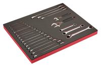 Bijzondere kenmerken * 23-delig * 1RM steekringratelsleutel 8, 9, 10, 11, 12, 13, 14, 15, 16, 17, 18, 19, 22, 24 mm * 4040M sleutels met scharnierende kop 8-9, 10-11, 12-13, 14-15, 16-17, 18-19 mm * 9029 verstelbare moersleutel * 9031 verstelbare moersleutel * Met lasermarkering * Foam inlay bestand tegen Skydrol, benzine, water en UV-stralen * Milieuvriendelijke Foam inlay * Druksysteem om gereedschap gemakkelijk te pakken * Foam inlay voor het overzichtelijk opbergen van gereedschap * FOD-systeem: Foam inlays in twee kleuren voor makkelijk identificeren van ontbrekende gereedschappen