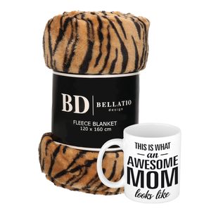 Cadeau moeder set - Fleece plaid/deken tijger print 120 x 160 cm met Awesome Mom mok 300 ml. Compleet ontspanning cadeau set voor Mama's die graag met een kleedje en een warme mok thee/ koffie/ chocolademelk op de bank relaxen.Plaid/deken/kleed van zeer zachte fleece, ook wel coral/ teddy/ knuffel/ fluffy of mickey fleece genoemd. Heerlijk zacht kl...