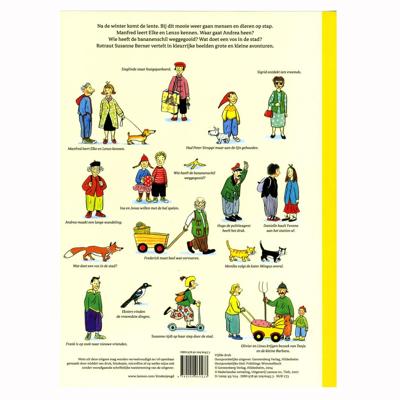 Stevig en groot kartonboek Een panoramische blik op het drukke leven in de stad Tientallen personages beleven grote en kleine avonturen Kleurrijke illustraties van Rotraut Susanne Berner Na de winter komt de lente. Waar gaat Andrea heen? Wie heeft de bananenschil weggegooid? Wat doet een vos in de stad? Auteur: Rotraut Susanne Berner. Inhoud: 16 pagina's. Geschikt vanaf 4 jaar.