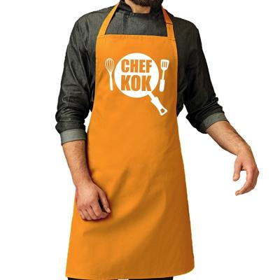 Chef kok barbeque schort / keukenschort in het okergeel voor heren. Dit bbq schort is bedrukt met de afbeelding van een koekenpan, bestek en de tekst: Chef kok. Materiaal: 65% polyester/35% katoen. One size: breedte 72 cm, lengte 86 cm. Kwaliteit: 195 grams. Leuk voor verjaardag en vaderdag.