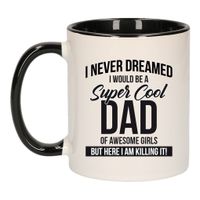 Cool dad of awesome boys cadeau mok / beker 300 ml. Deze beker heeft een zwarte binnenkant en een zwart oor, is magnetron- en vaatwasmachine bestendig en heeft een inhoud van 300 ml. De mok / beker is bedrukt met de tekst: I never dreamed I would be a super cool dad of awesome boys, but here I am killing it. Materiaal: keramiek. Leuke mok om aan papa te geven op zijn verjaardag, Vaderdag of een andere gelegenheid. Hoogte: 9,5 cm. Doorsnede: 8,2 cm.
