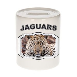 Dieren gevlekte jaguar spaarpot - jaguars spaarpot jongens en meisjes 9 cm. Deze witte spaarpot is tweezijdig bedrukt met een jaguars afbeelding en de tekst: jaguars. Een musthave voor een echte dieren/ jaguars liefhebber of iemand die alles van jaguars spaart. Erg leuk om cadeau te doen aan een echte jaguars fan!Materiaal: keramiek.Formaat: 8 x 9 cm.