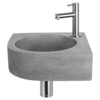Deze combinatie bestaat uit het donker betonnen hoekfonteintje Cleo met rode kopere kruis koudwaterkraan, afvoerplug en sifon. Het kraangat zit in de hoek van dit plaatsbesparende wasbakje Cleo. Het betonnen materiaal is zeer stevig en heeft een waterdichte coating.