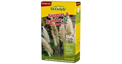 Ecostyle Siergras&bamboe-az 800gSiergras & Bamboe-AZ is speciaal ontwikkeld voor het voeden van siergrassen en bamboe in je tuin. Deze meststof is verrijkt met een unieke mix van bacteriën, schimmels en protozoa die zorgen voor een gezond bodemleven. Hierdoor krijgen je siergrassen en bamboeplanten extra voeding en groeien ze krachtig, wat bijdraagt aan een karaktervolle tuin.Wat maakt Siergras & Bamboe-AZ uniek? Bevat speciale bacteriën en gepatenteerde protozoa (ProtoPlus®) die de opname van voedingsstoffen verbeteren. Toegevoegde mycorrhiza-schimmel RhizaMax® bevordert een gezond wortelstelsel, waardoor planten efficiënter water en voedingsstoffen kunnen opnemen. Langdurige werking van 120 dagen, waardoor de planten continu worden voorzien van essentiële voedingsstoffen.Gebruiksaanwijzing: Verdeel de mestkorrels gelijkmatig over de aarde rondom je siergrassen en bamboe. Werk de korrels lichtjes door de bovenste laag van de grond. Geef na het aanbrengen water om de werking van de mest te versnellen. Voor een nog beter resultaat, strooi jaarlijks AZ-Kalk bij je siergrassen en bamboe. Bemest je siergras en bamboe twee keer per jaar: de eerste bemesting tussen maart en juni, en de tweede bemesting ongeveer 120 dagen later tussen juli en oktober.Dosering: Jonge aanplant en kleine siergrassen: 30 gram per plant. Bestaande planten en grote siergrassen: 75 gram per plant.Opmerking: Eén eetlepel komt overeen met 15 gram.Specificaties: Geschikt voor plant: Siergras en bamboe. Dosering: Zie bovenstaande specificaties per type plant. Samenstelling: Beendermeel, haarmeel, hoefmeel, hoornmeel, meel van oliekoeken (druivenpitten, soja, shea bonen), moutkiemen, vinasse-extract en vleesbeendermeel. Bevat bacteriën (Bacillus sp.), protozoa (Cercomonas sp. en Rosculus sp.), en mycorrhiza-schimmels (Rhizophagus sp.). Werkzame stof: NPK 7-3-6. Toepassing: Verhoogt de weerstand, versterkt het wortelstelsel en bevordert de bloeikracht van siergras en bamboe. Toepassingsperiode: Eerste bemesting tussen maart en juni, tweede bemesting tussen juli en oktober. Geschikt voor aantal m2: Geschikt voor 25 planten. Type product: Organische meststof.Siergras & Bamboe-AZ biedt een complete voedingsoplossing voor siergrassen en bamboe, waardoor ze gezond en krachtig groeien met prachtige pluimen en een robuuste uitstraling.