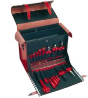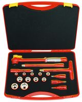 Assortiment in kunststof koffer met 2-kleurige quick-check-inlay voor een snelle volledigheidscontrole 2-laags veiligheids-dompelisolatie conform IEC 60900 Inhoud set: 1 Omschakelbare ratel 1/2", 260 mm, nr. 360494 1 T-handgreep 1/2", 200 mm, nr. 370 2 Verlengstukken 1/2", 125 - 250 mm, nr. 375...