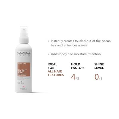 Goldwell Stylesign Sea Salt Spray met natuurlijk zout creëert direct een ongedwongen en warrige look, geïnspireerd door de oceaan. Perfect om golven te versterken of voor het creëren van undone looks in halflang en kort haar. De minerale spray zorgt moeiteloos voor prachtige beachy stijlen, voegt body, grip en textuur toe, en houdt tegelijkertijd het vocht vast. Met een sterke holdfactor van 4/5 en glansniveau 0/3 is deze spray geschikt voor alle haartexturen. Dit product is dermatologisch getest en vrij van sulfaten, minerale olie en siliconen. De veganistische formule is kleurveilig en CO₂-gecompenseerd, wat betekent dat het klimaatneutraal is. Ideaal voor elke haartype en hoofdhuidprobleem.