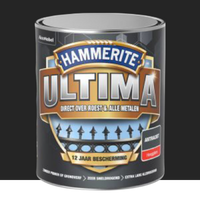 Hammerite UltimaHammerite Ultima is de perfecte metaalverf voor elke schilderklus Zijn langdurige bescherming en vermogen om roestige oppervlakken te bedekken zonder primer zijn slechts twee van zijn vele uitstekende eigenschappen. Of u nu een fulltime professionele schilder bent of een hobbyist op zoek naar duurzamere verfoplossingen, Hammerite Ultima kan u het type kwaliteit bieden dat aan uw behoeften voldoet. Aarzel niet als het gaat om het volledig en efficiënt beschermen van metalen - kies Hammerite Ultima voor de ultieme schoonheid en duurzame resultaten Probeer het vandaag nog en ontdek waarom het een favoriet is onder degenen die het beste weten over het schilderen van metaal.. Plus- en minpuntenLevensduur tot 12 jaar Direct over roest Elke metaalsoort Niet geschikt voor binnenWaar gebruik ik Hammerite Ultima voor?Hammerite Ultima gebruik je voor het behandelen en beschermen van metaal.Hammerite Ultima kan direct over roest en geeft tot 12 jaar bescherming.Waarom moet ik voor Hammerite Ultima kiezen?Hammerite Ultima kies je omdat het goed is en makkelijk. Je hoeft niet eerst al het roest er af te halen. Je kunt Hammerite Ultima direct aanbrengen zonder primer op de meeste metaalsoorten..Wat is het verbruik per m2 van dit product?Het verbruik van Hammerite Ultima is 12 tot 16 m2 per liter. Onze ervaring is echter wel iets anders, want de meeste schilders komen op een verbruik van 10 tot 12m2 per liter voor de Hammerite. Je kunt beter iets te veel verf hebben, dan iets te weinig.In welke kleuren is dit product te mengen?Hammerite Ultima kunnen wij helaas niet mengen. Hammerite Ultima is verkrijgbaar in een aantal standaard kleuren.Hammerite Ultima zwartHammerite Ultima antracietHammerite Ultima standgroenHammerite Ultima standblauwHammerite Ultima wit/RAL 9016Meest gekozen kleuren Hammerite UltimaHammerite Ultima zwartDeze diep zwarte kleur fabrieksgemengd in Hammerite Ultima is verkrijgbaar in een hoogglans en matte afwerking voor buiten. Hammerite Ultima RAL 9005 kan direct over roest heen en geeft 12 jaar bescherming.Hammerite Ultima antracietAntraciest is naast zwart een veelgekozen kleur, Hammerite Ultima antraciet is een donkergrijze metaallak geschikt voor de meeste metaalsoorten. Hammerite Ultima antraciet geeft een bescherming tot wel 12 jaar en is verkrijgbaar in hoogglans en mat..Hammerite Ultima standgroenDonkergronde kleur uit de Sikkens kleurenwaaier. Hammerite Ultima standgroen is een zeer gewilde kleur voor buitenwerkzaamheden. Hammerite Ultima beschermd tot wel 12 jaar en kan direct over roest worden aangebracht.Hammerite Ultima standblauwHammerite Ultima standblauw is een donkerblauwe kleur uit de Sikkens kleurenwaaier. Hammerite Ultima standblauw kunnen wij leveren in hoogglans of mat voor een perfecte metaal afwerking.Hammerite Ultima wit/RAL 9016Hammerite Ultima Wit/RAL 9016 is de meest lichte kleur uit de Hammerite Ultima kleuren. Wil je jusit een donkerer kleur laten afsteken? Kies dan voor Hammerite Ultima wit in hoogglans of mat.Welke glans heeft Hammerite UltimaHammerite Ultima hoogglans is de perfecte keuze als je een metaal wilt afwerken met een glimmende verf of lak. Hammerite Ultima hoogglans heeft de hoogst mogelijke glans met een optimale bescherming tot wel 12 jaar en is verkrijgbaar in bovenstaande kleuren. Hammerite Ultima mat is een nieuwe lijn van Hammerite Ultima, voorheen was de Hammerite Ultima altijd in hoogglans. Hammerite Ultima mat kies je voor als je een neutrale afwerking wilt. Hammerite Ultima mat zie je niet alels op en geeft een doffe uitstraling.Hieronder het glans systeem waar Hammerite Ultima mee werkt,Hoogglans (60-90); ideaal voor buitenwerkZijdeglans (30-60); ideaal voor oneffenheden in de ondergrondMatte verf (kleiner dan 30); ideaal voor binnenwerkWelke kwast heb ik nodig voor Hammerite UltimaVoor het aanbrengen van Hammerite Ultima is het belangrijk om de juiste kwast te kiezen. Met de juiste kwast wordt de lak gelijkmatig aangebracht, met een optimale opname en afgifte. Wij zijn van mening dat de VP Platina Mixvezel de juiste vezels bevat voor het beste eindresultaat. Deze kwast is opgebouwd uit verschillende vezels, wat een combinatie is van traditionele varkensharen en een selectie synthetische vezels.Welke lakroller heb ik nodig?Met een roller is het gewenst om een strak en gelijkmatig eindresultaat te creëren. Je moet er niet aan denken om pluisjes uit je schilderwerk te vissen. De opname en afgifte is hierin essentieel. Wij adviseren voor het werken met een alkydlak, of verf, de Copenhagen viltroller of de Anza viltroller.Hammerite Ultima 3 in 1 - Hammerite Ultimate MatNa jaren van testen kan ik met een gerust hart zeggen dat de Hammerite Ultima 3 in 1 een fantastisch product is. Het is gemakkelijk aan te brengen en biedt een geweldige roestbescherming en een duurzame grondlaag en afwerking. Eén keer schilderen met drie lagen gaat tot 12 jaar mee. Het is ook