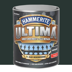 Hammerite UltimaHammerite Ultima is de perfecte metaalverf voor elke schilderklus Zijn langdurige bescherming en vermogen om roestige oppervlakken te bedekken zonder primer zijn slechts twee van zijn vele uitstekende eigenschappen. Of u nu een fulltime professionele schilder bent of een hobbyist op zoek naar duurzamere verfoplossingen, Hammerite Ultima kan u het type kwaliteit bieden dat aan uw behoeften voldoet. Aarzel niet als het gaat om het volledig en efficiënt beschermen van metalen - kies Hammerite Ultima voor de ultieme schoonheid en duurzame resultaten Probeer het vandaag nog en ontdek waarom het een favoriet is onder degenen die het beste weten over het schilderen van metaal.. Plus- en minpuntenLevensduur tot 12 jaar Direct over roest Elke metaalsoort Niet geschikt voor binnenWaar gebruik ik Hammerite Ultima voor?Hammerite Ultima gebruik je voor het behandelen en beschermen van metaal.Hammerite Ultima kan direct over roest en geeft tot 12 jaar bescherming.Waarom moet ik voor Hammerite Ultima kiezen?Hammerite Ultima kies je omdat het goed is en makkelijk. Je hoeft niet eerst al het roest er af te halen. Je kunt Hammerite Ultima direct aanbrengen zonder primer op de meeste metaalsoorten..Wat is het verbruik per m2 van dit product?Het verbruik van Hammerite Ultima is 12 tot 16 m2 per liter. Onze ervaring is echter wel iets anders, want de meeste schilders komen op een verbruik van 10 tot 12m2 per liter voor de Hammerite. Je kunt beter iets te veel verf hebben, dan iets te weinig.In welke kleuren is dit product te mengen?Hammerite Ultima kunnen wij helaas niet mengen. Hammerite Ultima is verkrijgbaar in een aantal standaard kleuren.Hammerite Ultima zwartHammerite Ultima antracietHammerite Ultima standgroenHammerite Ultima standblauwHammerite Ultima wit/RAL 9016Meest gekozen kleuren Hammerite UltimaHammerite Ultima zwartDeze diep zwarte kleur fabrieksgemengd in Hammerite Ultima is verkrijgbaar in een hoogglans en matte afwerking voor buiten. Hammerite Ultima RAL 9005 kan direct over roest heen en geeft 12 jaar bescherming.Hammerite Ultima antracietAntraciest is naast zwart een veelgekozen kleur, Hammerite Ultima antraciet is een donkergrijze metaallak geschikt voor de meeste metaalsoorten. Hammerite Ultima antraciet geeft een bescherming tot wel 12 jaar en is verkrijgbaar in hoogglans en mat..Hammerite Ultima standgroenDonkergronde kleur uit de Sikkens kleurenwaaier. Hammerite Ultima standgroen is een zeer gewilde kleur voor buitenwerkzaamheden. Hammerite Ultima beschermd tot wel 12 jaar en kan direct over roest worden aangebracht.Hammerite Ultima standblauwHammerite Ultima standblauw is een donkerblauwe kleur uit de Sikkens kleurenwaaier. Hammerite Ultima standblauw kunnen wij leveren in hoogglans of mat voor een perfecte metaal afwerking.Hammerite Ultima wit/RAL 9016Hammerite Ultima Wit/RAL 9016 is de meest lichte kleur uit de Hammerite Ultima kleuren. Wil je jusit een donkerer kleur laten afsteken? Kies dan voor Hammerite Ultima wit in hoogglans of mat.Welke glans heeft Hammerite UltimaHammerite Ultima hoogglans is de perfecte keuze als je een metaal wilt afwerken met een glimmende verf of lak. Hammerite Ultima hoogglans heeft de hoogst mogelijke glans met een optimale bescherming tot wel 12 jaar en is verkrijgbaar in bovenstaande kleuren. Hammerite Ultima mat is een nieuwe lijn van Hammerite Ultima, voorheen was de Hammerite Ultima altijd in hoogglans. Hammerite Ultima mat kies je voor als je een neutrale afwerking wilt. Hammerite Ultima mat zie je niet alels op en geeft een doffe uitstraling.Hieronder het glans systeem waar Hammerite Ultima mee werkt,Hoogglans (60-90); ideaal voor buitenwerkZijdeglans (30-60); ideaal voor oneffenheden in de ondergrondMatte verf (kleiner dan 30); ideaal voor binnenwerkWelke kwast heb ik nodig voor Hammerite UltimaVoor het aanbrengen van Hammerite Ultima is het belangrijk om de juiste kwast te kiezen. Met de juiste kwast wordt de lak gelijkmatig aangebracht, met een optimale opname en afgifte. Wij zijn van mening dat de VP Platina Mixvezel de juiste vezels bevat voor het beste eindresultaat. Deze kwast is opgebouwd uit verschillende vezels, wat een combinatie is van traditionele varkensharen en een selectie synthetische vezels.Welke lakroller heb ik nodig?Met een roller is het gewenst om een strak en gelijkmatig eindresultaat te creëren. Je moet er niet aan denken om pluisjes uit je schilderwerk te vissen. De opname en afgifte is hierin essentieel. Wij adviseren voor het werken met een alkydlak, of verf, de Copenhagen viltroller of de Anza viltroller.Hammerite Ultima 3 in 1 - Hammerite Ultimate MatNa jaren van testen kan ik met een gerust hart zeggen dat de Hammerite Ultima 3 in 1 een fantastisch product is. Het is gemakkelijk aan te brengen en biedt een geweldige roestbescherming en een duurzame grondlaag en afwerking. Eén keer schilderen met drie lagen gaat tot 12 jaar mee. Het is ook