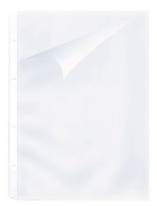 Extra zware kwaliteit showtas van PP 120 mµ, geschikt voor formaat A4, gladde uitvoering, copysafe. Boven- en linkerzijde open en de ponsgaten zijn met een witte strook versterkt. 4-gaats.