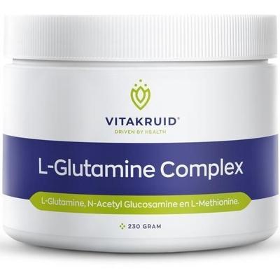 Vitakruid L-Glutamine Complex.L-Glutamine is bij als vrij aminozuur betrokken bij de meeste stofwisselingsprocessen, zoals de zuur-basebalans, de stofwisseling van koolhydraten, vetten en eiwitten. Glutamine is een belangrijke bouwstof voor glucosemoleculen en een belangrijke energiebron voor de dunne darm. De behoefte aan Glutamine neemt enorm toe in periode dat er een beroep wordt gedaan op het immuunsysteem. L-Glutamine is met name belangrijk voor het Common Mucosal Immune System (CMIS), de immuunfunctie in de slijmlagen van het lichaam zoals in de luchtwegen, de geslachtsorganen maar vooral ook in het maag-darmkanaal. Glutamine is voor het behoud van een goede darmfunctie. Een gezond darmslijmvlies is van groot belang voor een goede opname van voedingsstoffen. N-Acetylglucosamine ondersteunt de opbouw en het herstel van het darmepitheel, de synthese van darmslijmvlies en bevordert de groei van goede bacteriën. N-Acetyl-Glucosamine is nodig voor de synthese van andere glycosaminogly…