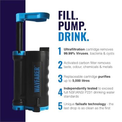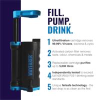Waterfilter dat ondanks het kleine formaat nog steeds alle bacteriën, parasieten én virussen uit het water filtert, dankzij het uitgekiende hollow-fibre filterpatroon. Smaak, geur en zware metalen worden vervolgens gefilterd door de carbon-filter.