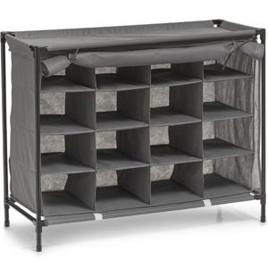 Een mobiele schoenenkast, om uw schoenen in op te bergen op de bijvoorbeeld de camping of als extra kast op een zolder. De kast is makkelijk in elkaar te zetten en heeft een grijs gekleurde hoes, met ritsen aan de voorkant, welke u over het geraamte kunt schuiven zodat uw schoenen schoon blijft. De kast bevat 16 vakken. Afmeting kast: ca. 84 x 35 x 66 cm. Afmeting schoenen vak: ca. 19 x 35 x 14 cm. Materiaal: vliesdoek/metaal/kunststof. Gebruiksaanwijzing: Ja, geen tekst enkel afbeeldingen. Zeller - Schoenen opbergers/opbergen - Schoenenkasten - Camping/zolder kasten - Stoffen kasten opvouwbaar.