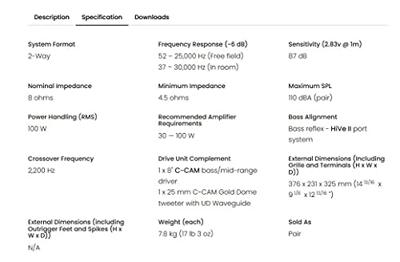 . Kenmerken: * 2-weg Boekenplank Luidspreker * 1 x 8-inch C-CAM bas / mid-range driver * 1 x 25 mm C-CAM Gold Dome tweeter met UD Waveguide * Basreflex - Hive II port systeem De Bronze 100 Hive II-poort aan de achterzijde is ontworpen en afgestemd om een gemakkelijke positionering mogelijk te maken zonder de prestaties te beïnvloeden. * Monitor Audio signature C-CAM Gold Dome Tweeter geüpgraded met de nieuwe Uniform Dispersion (UD) Waveguide voor een ongelooflijk levensecht geluid * C-CAM mid-bass driver met bijgewerkte kegelgeometrieën en Damped Concentric Mode (DCM) -technologie waardoor de luidspreker een dieper, voller geluid krijgt met behoud van een schone en nauwkeurige presentatie * Ontworpen voor prestaties - een ingewikkeld geoptimaliseerde luisterervaring voor muziek en films * Hive II-poort aan de achterzijde afgestemd voor gemakkelijke positionering zonder de geluidsprestaties te beïnvloeden * Akoestisch transparant zeshoekig rooster met