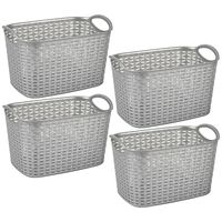 Set van 4x Plasticforte opbergmand/kastmandje. Ruim rondslingerend speelgoed, losse spulletjes of kleding gemakkelijk en netjes op met deze handige kast indeler mandjes. Handige mandjes geschikt voor in de kasten van slaapkamer, kinderkamer, zolder of garage. De manden hebben handige handgrepen en zijn gevlochten. Formaat: ca. 19 x 29 x 18 cm. Inhoud: 6,4 liter. Materiaal: kunststof. Stapelbaar/nestbaar. Merk: Plasticforte.