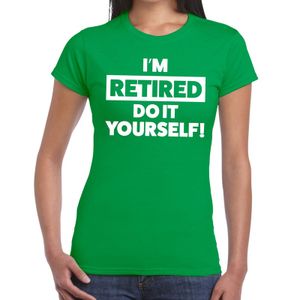 Groen I'm retired do it yourself! shirt voor dames. Op dit groene shirt staat in grote letters de tekst: I'm retired do it yourself! Leuk om aan de gepensioneerde te geven op een pensioen receptie of feest. Materiaal: 150 grams, 100% katoen.