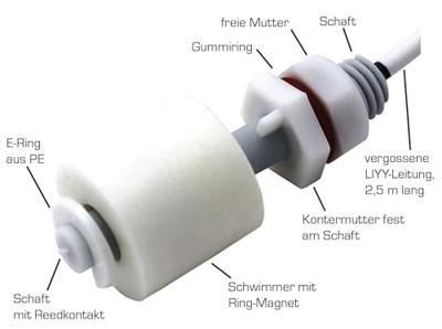 De vlotterschakelaar van kunststof is betrouwbaar, onderhouds- en slijtagevrij en eenvoudig te monteren. Het schakelcontact sluit vanaf een peil van ca. 4 cm en activeert de ingang van een...
