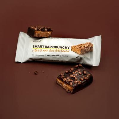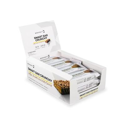 So crunchy, so delicious! Misschien wel de lekkerste en slimste eiwitreep ooit! Ben je op zoek naar een smakelijke en voedzame eiwitreep? Probeer dan onze Smart Bar Crunchy! Een heerlijke, knapperige eiwitreep met een laagje chocolade- en karamelsmaak. Perfect voor onderweg, na het sporten of als gezonde snack. Lekker, makkelijk en boordevol hoogwaardige eiwitten! Smart Bar Crunchy: wat is het? Smart Bar Crunchy is een eiwitreep met een lekkere smaak, textuur en crunch. De reep is rijk aan eiwitten en daardoor ideaal voor sporters en andere mensen met een actieve leefstijl. Eiwitten dragen bij aan de groei en instandhouding van spiermassa en ondersteunen snel herstel van je spieren na je training. Onze Smart Bar bevat ca. 160 calorieën* en geen toegevoegde suikers**. Wanneer kun je Smart Bar Crunchy nemen? Smart Bar Crunchy is makkelijk om mee te nemen naar de sportschool. Neem een eiwitreep bijvoorbeeld na je work-out voor snel herstel van je spieren. Je kunt natuurlijk ook een reep
