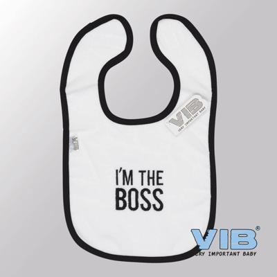 Baby Slabbetje velours I'm the boss wit. Dit mooie slabbetje van het merk VIB (Very Important Baby) is een aanwinst om cadeau te doen of om natuurlijk gewoon zelf te gebruiken.De luxe slabbetjes zijn gemaakt van zacht velours badstof (100% Oeko tex gecertificeerd katoen, madeira borduurgaren)Dit voorkomt niet alleen irritaties aan de huid, het geeft de slabbetjes ook een mooie uitstraling.Alle slabbetjes zijn voorzien van klittenband sluiting die makkelijk te verstellen is naar de ideale maat. Kortom, functioneel en schattig tegelijk.De opdruk is geborduurd op het velours slabbetje dus blijft in de was (30 graden aanbevolen- 40 graden mogelijk) altijd goed.
