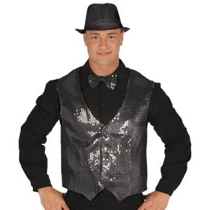 Verkleed set voor heren - gilet/vlinderstrikje/hoed - zwart - pailletten - one size - carnaval