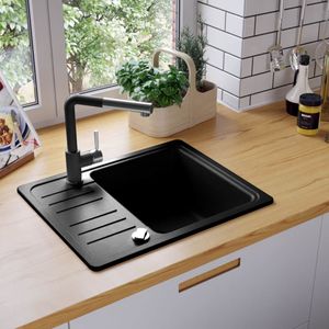 Gootsteen enkele bak graniet zwartOnze granieten keukengootsteen is een tijdloze aanvulling op je keukeninrichting. Hij heeft een enkele, extra diepe bak en een slank ontwerp. Het hoogwaardige graniet maakt de gootsteen hittebestendig, kras- en slagvast en gemakkelijk schoon te maken. Een zeefje is ook inbegrepen voor eenvoudige verwijdering van vuil. De gootsteen is eenvoudig te monteren.186,95