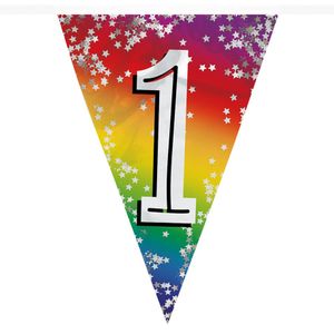 Vlaggenlijn 1 jaar versiering thema vlaggetjes slinger 6 meter. Materiaal: glitter folie plastic. Feestartikelen voor een verjaardag. Enkelzijdige feestelijke bedrukking van de leeftijd. Voor binnen en buiten geschikt.