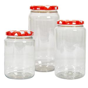 Weckpot/voorraadpotten set Classico, 9x stuks, met een inhoud van 500 ml, 950 ml en 1500 ml(3x stuks per formaat). Gemaakt van stevig kunststof met metalen draaideksel in het rood. Deze voorraadpotten beschikken over een luchtdichte afsluiting en zijn zeer geschikt om langdurig voedsel in te bewaren zoals zelfgemaakte jam of gefermenteerde groenten. Je kan er natuurlijk ook andere artikelen of voedsel in bewaren. Afmetingen: ca. D7 x H 11 cm, D8 x H 17 cm en D10 x H19 cm. Geschikt voor in de vaatwasser. BPA vrij. Lichtgewicht voorraad potten. , Dit artikel bestaat uit:, 3x Weckpot/voorraadpot Classico - 500 ml - kunststof - draaideksel - rood - D7 x H11 cm, 3x Weckpot/voorraadpot Classico - 950 ml - kunststof - draaideksel - rood - D8 x H17 cm, 3x Weckpot/voorraadpot Classico - 1500 ml - kunststof - draaideksel - rood - D10 x H19 cm