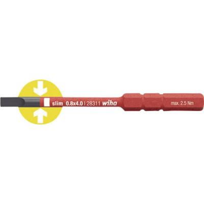 Bijzondere kenmerken * Omkeerklingen geïsoleerd. * Per stuk getest conform IEC 60900 Door de in het voorste bereik volledig in de kling geïntegreerde beschermingsisolatie kunnen ook diepliggende schroeven goed bereikt worden (niet bij sleuf 2,5 en 3,0 mm alsmede TORX® T8x75 en T10x75) Voor toepassing met VDE-geïsoleerde momentgrepen en VDE-geïsoleerde bithouders (niet inbegrepen in leveringsomvang - apart bestellen)Technische gegevens * Maat: 6,5 x 75 mm * Type: VDE SlimBit * Merk: Wiha * Uitvoering: Sleuf * Eigenschap: VDE-geïsoleerd